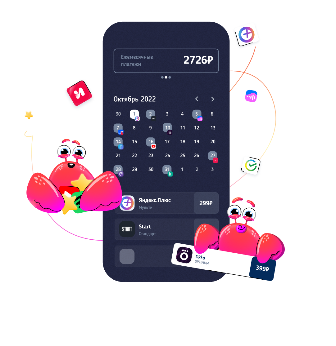 SubsCrab помогает вести учет ваших подписок, чтобы поддерживать ваши текущие расходы в актуальном состоянии. Отслеживайте все свои подписки в одном приложении.